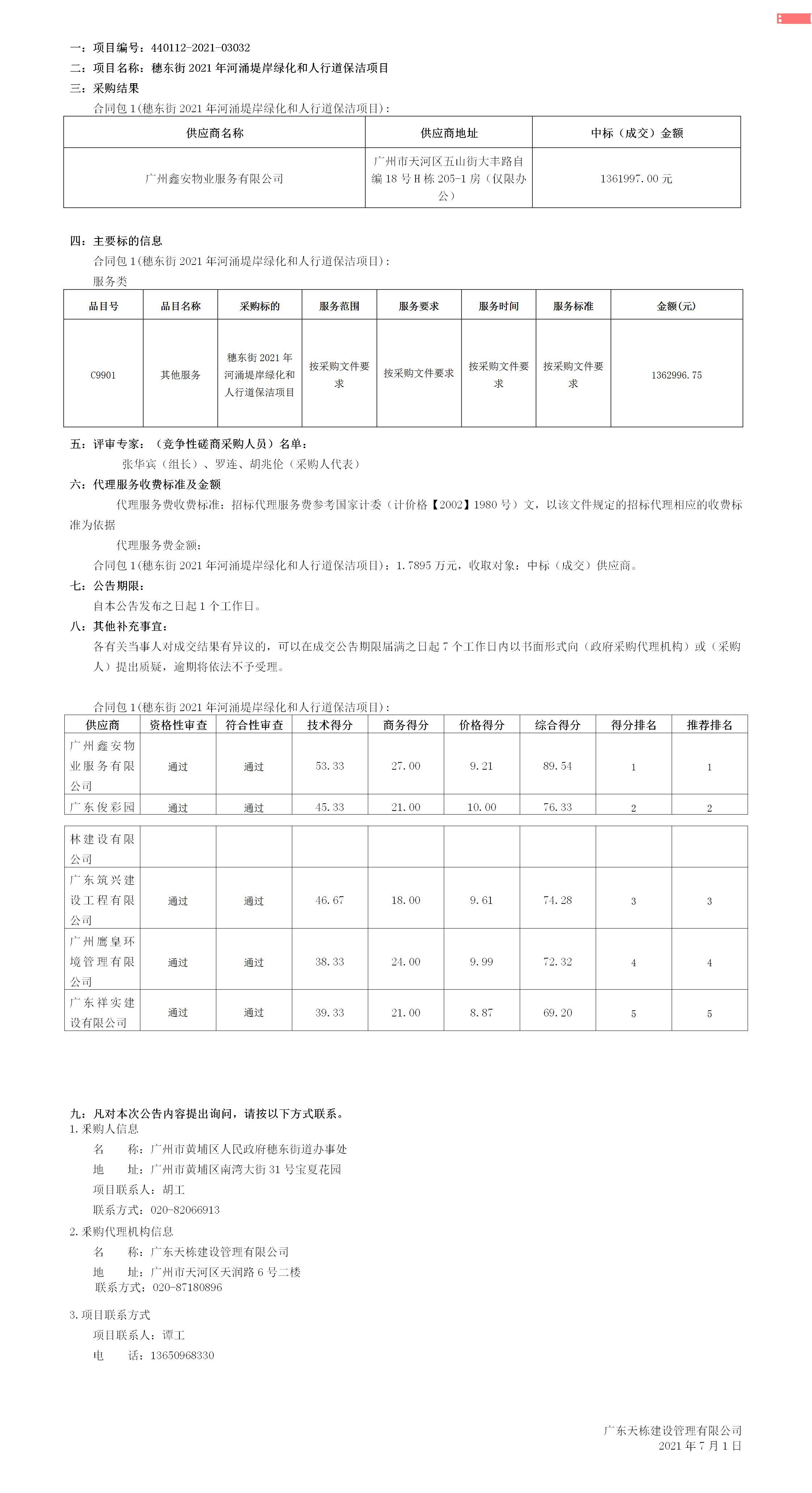 廣州市黃埔區(qū)人民政府穗東街道辦事處關(guān)于2021年河涌堤岸綠化和人行道保潔項(xiàng)目的計(jì)劃中標(biāo)(成交)結(jié)果公告